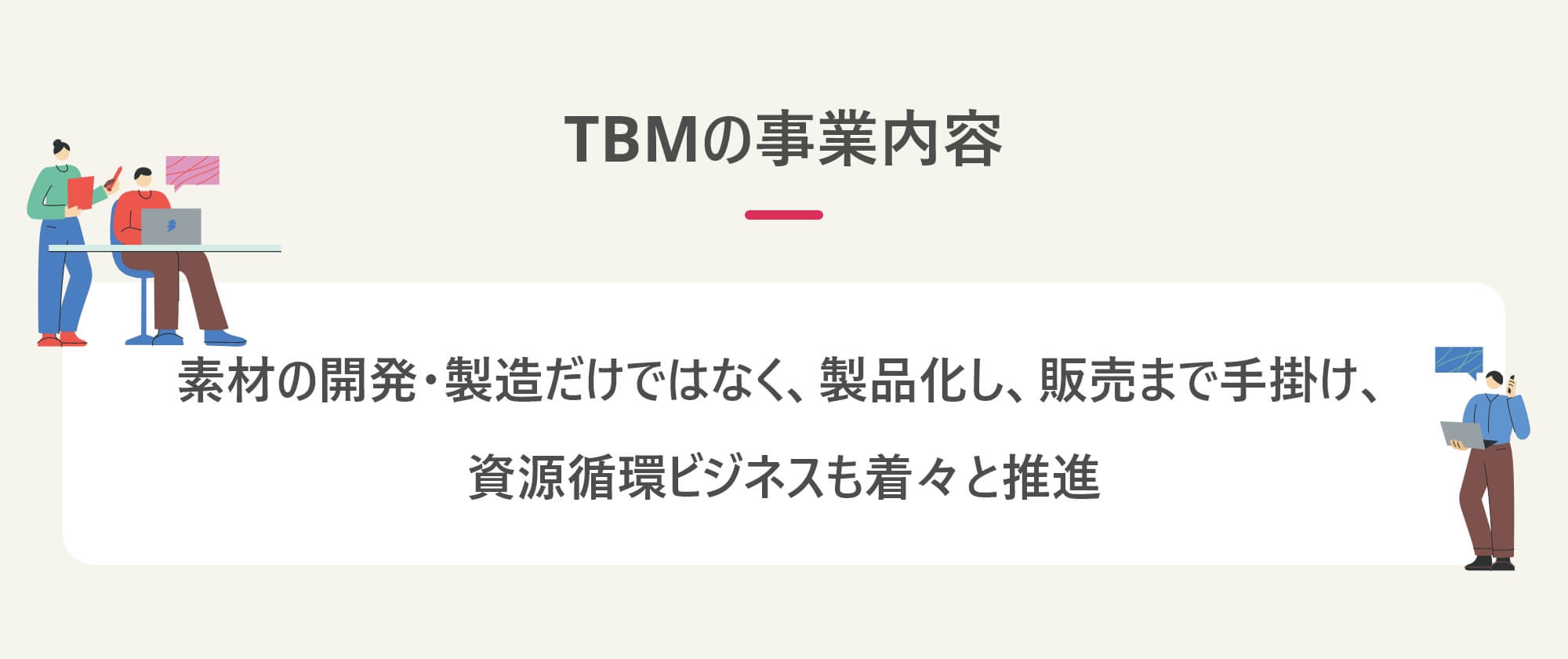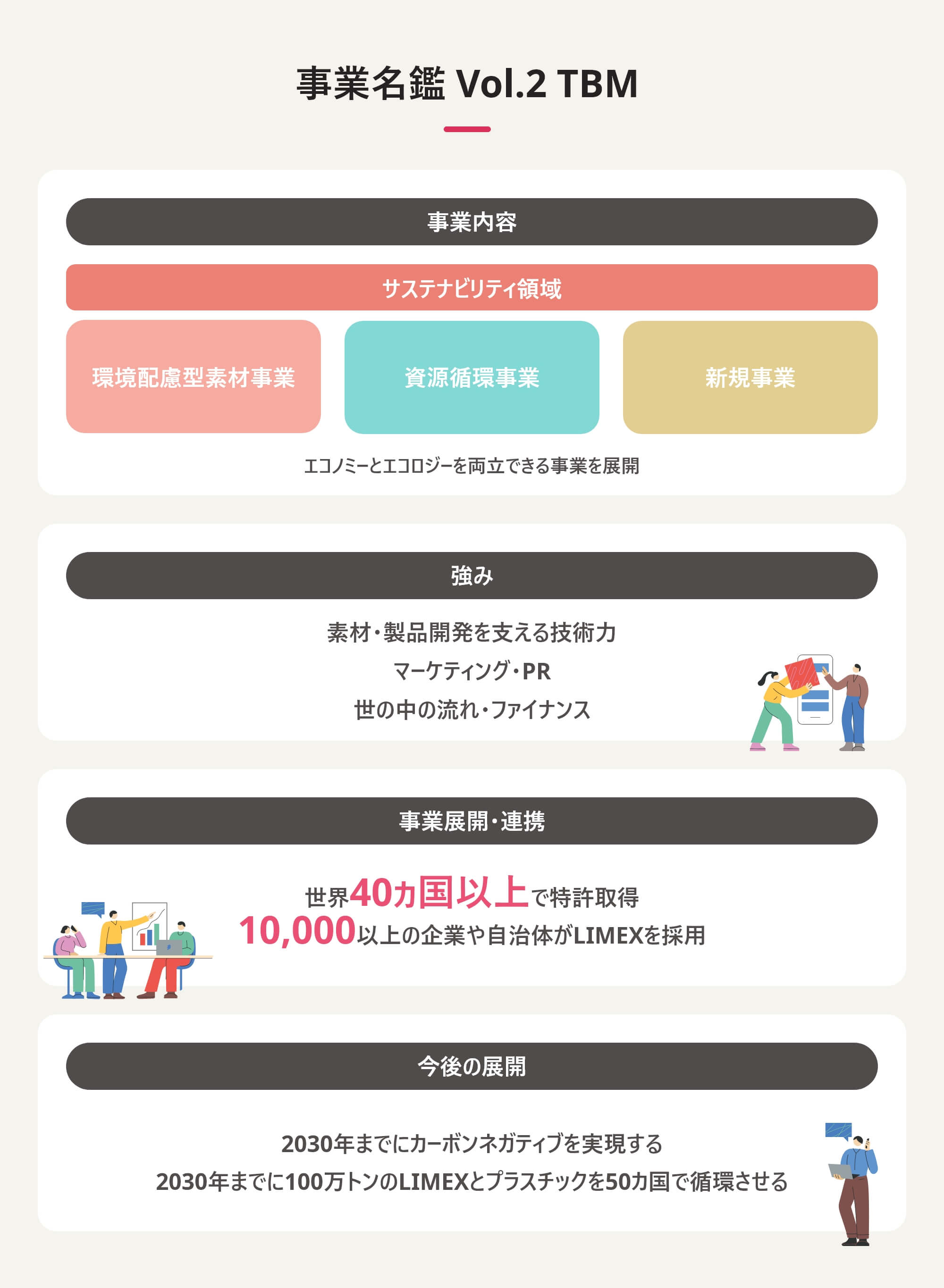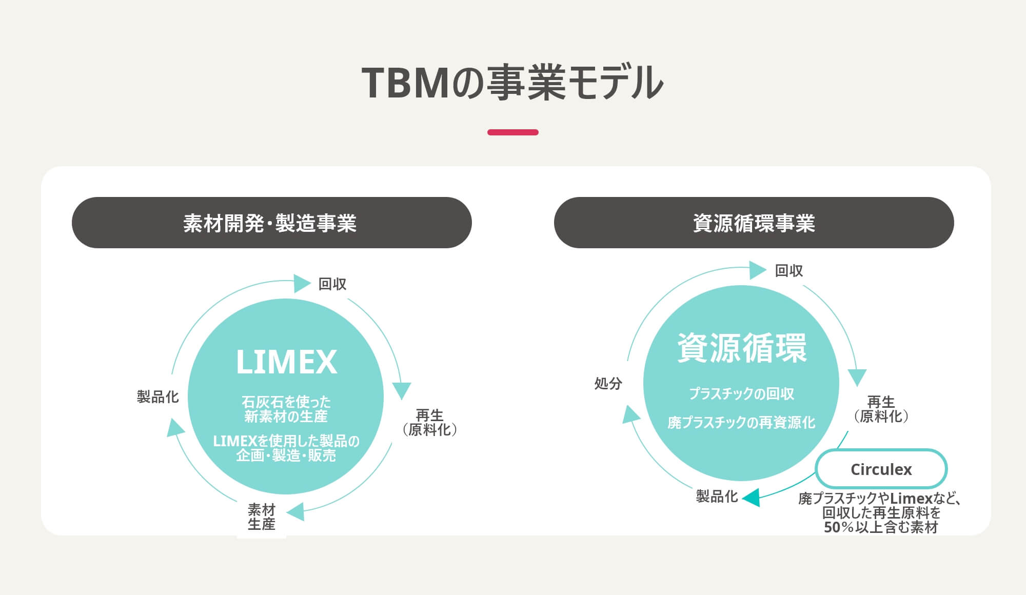 山﨑敦義(現CEO)が100年後も挑戦し続ける事業、組織をつくりたいという想いから2011年にTimes Bridge Managementが社名の由来であるTBMを設立し、自社開発した新素材LIMEX(ライメックス)の開発・製造、販売を開始。「過去を活かして未来を創る。100年後でも持続可能な循環型イノベーション」をビジョンに掲げ、環境配慮型の素材開発及び製品の製造、販売と資源循環を促進する事業の柱として、サステナビリティ領域のトッププレイヤーを目指している。日中欧米を含む40ヵ国以上で、200件以上の特許を権利化し、会社設立以降の資金調達額は236億円を超える。経済産業省「J-Startup Impact」認定企業。世界経済フォーラム(ダボス会議)のユニコーン・コミュニティに参画。2023年の日本経済新聞「NEXTユニコーン調査」で第7位(推計企業価値1344億円)にランクインし、日本の数少ないユニコーン企業の1社として注目されている