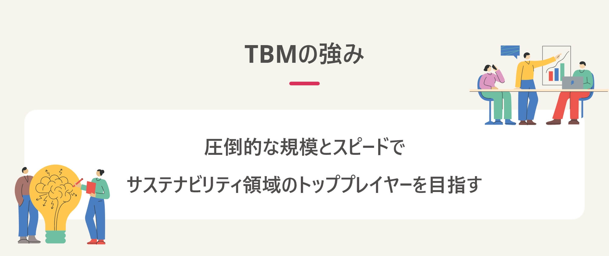 2011年の会社設立から12年ほどで社員が328名(2023年10月時点)まで増えました。しかし私たちが目指すサステナビリティ革命を実現するには、もっと多くの仲間を集め国内外での事業成長を図っていかねばなりません。これからは経営体制や事業組織の強化とともに優秀な人材をたくさん確保していく必要があります。2021年からは新卒採用を開始しましたが、中途採用者を含めても20代社員の割合はまだ全体の2割ほどです。一般的なスタートアップと比べて社員の年齢層が幅広く、40代、50代の経験豊富な年代層が目立ち、ベテラン層の豊富な経験や知見と若手がもたらす新たなエネルギーが今後の会社の更なる成長には不可欠になっています。その為新卒採用の強化は経営の重要テーマの一つでもあります。これからTBMを支え、将来に渡って受け継がれていくTBMらしいカルチャーを築いていくのは今後の新卒社員たちです。ここでどれだけ優秀で挑戦意欲がある人材を数多く集められるかが課題だと思います。