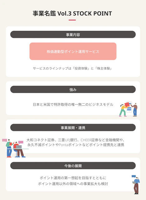代表の土屋清美が最初に創業した金融機関向けITサポートの会社を経営するなかで、日本人の金融リテラシー問題の存在に着目。その解決策として着想した「誰もが持つポイントを使って資産運用・投資する」というサービスを実現するため2016年にSTOCK POINTを設立。同年中に個別株の値動きとポイントを連動させた「株価連動型ポイント運用システム」の特許を取得。2017年に「StockPoint」サービスをリリース。その後、クレディセゾンの永久不滅ポイントや、ロイヤリティマーケティングのPontaポイントなどのポイント提携先を拡大。現在は「StockPoint」の他に、金融機関がスポンサードする「StockPoint for CONNECT」、「STOCKPOINT for MUFG」、「StockPoint for CHEER証券」があり、株主体験ができる「ココカブ」などのサービスも展開している企業詳細:コーポレートサイト