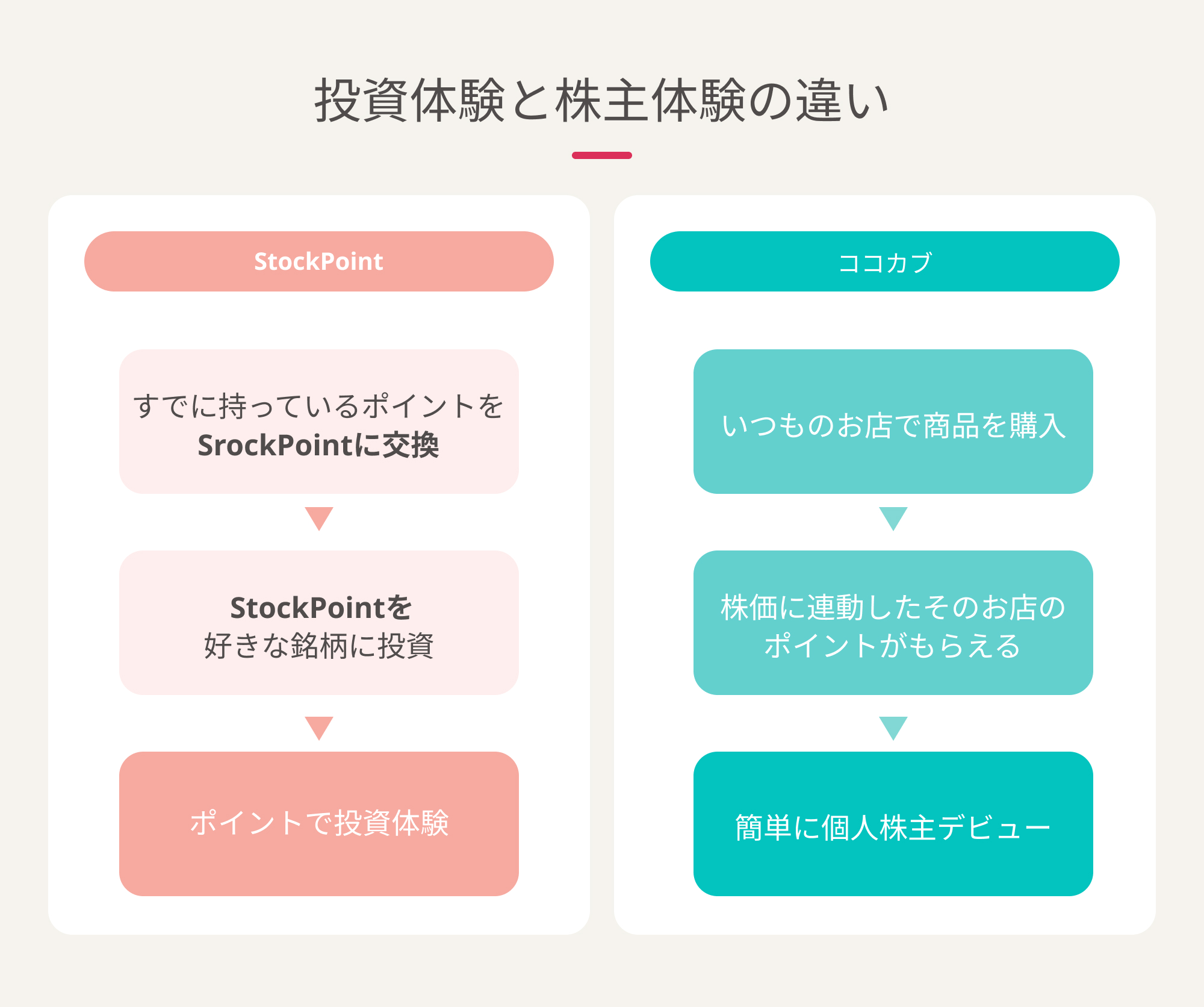 「投資体験」については現在、「StockPoint」「StockPoint for CONNECT」「STOCKPOINT for MUFG」「StockPoint for CHEER証券」の4つのポイント運用アプリを展開しています。アプリごとに連携しているポイントが異なるため、自分が持っているポイントに合わせてアプリを選べます。アプリで「StockPoint」に交換し、約360銘柄の株式のなかから自由に投資先を選んで運用できます。ユーザーにとっては現金を使わず投資体験ができ、ポイントを増やせる可能性もあります。一方、証券会社等の金融機関は「StockPoint」に連動したサービスによってユーザーに投資体験してもらうことで、その後の本格的な投資につながるユーザーの開拓も図れます。さらに投資先の企業にとっても、実際の株主と同様に自社にロイヤルティーを感じてもらえますから、ファンマーケティングや顧客エンゲージメント施策の一環として有効活用できるわけです。この顧客エンゲージメント向上効果をふまえて、株主体験のサービスとして開発したのが「ココカブ」です。ココカブは、自分の好きな企業の商品やサービスを購入すると、その企業の株価に連動したココカブポイントがもらえます。ですから実際の株主ではなくても、ココカブを通じてその企業の株価の動きを体験できるわけです。 また貯まったポイント数に応じて実際の株式に交換することもできるので、普通に生活し消費行動をすること自体が投資につながり、「いつのまにか株主」になれる。ココカブはそんなサービスです。