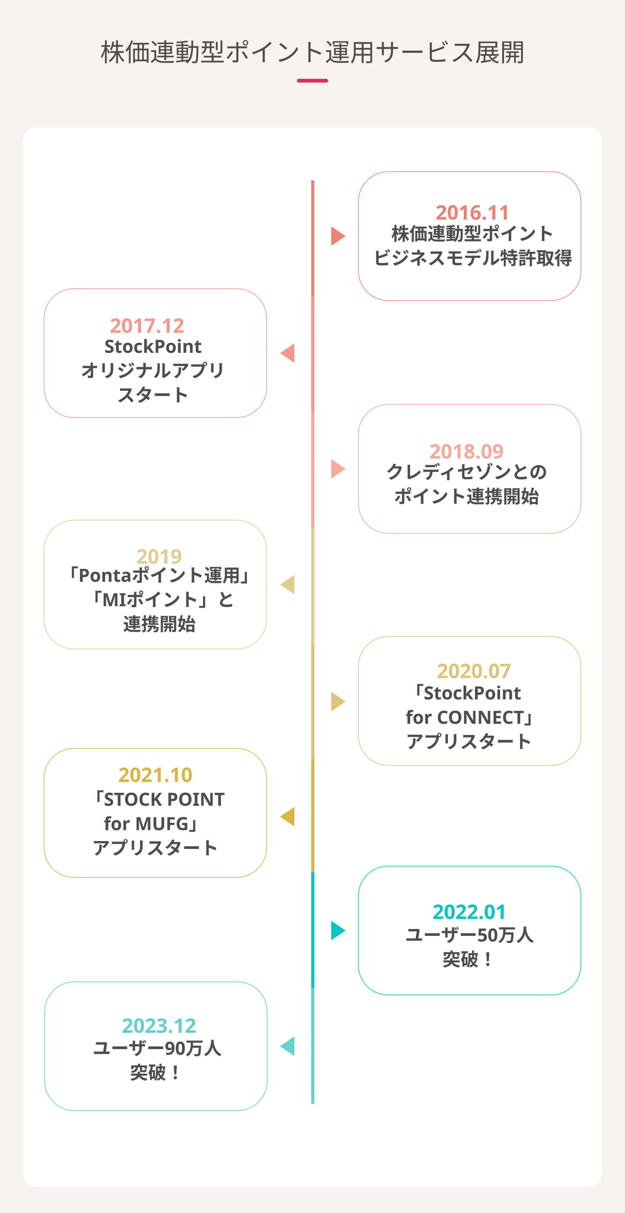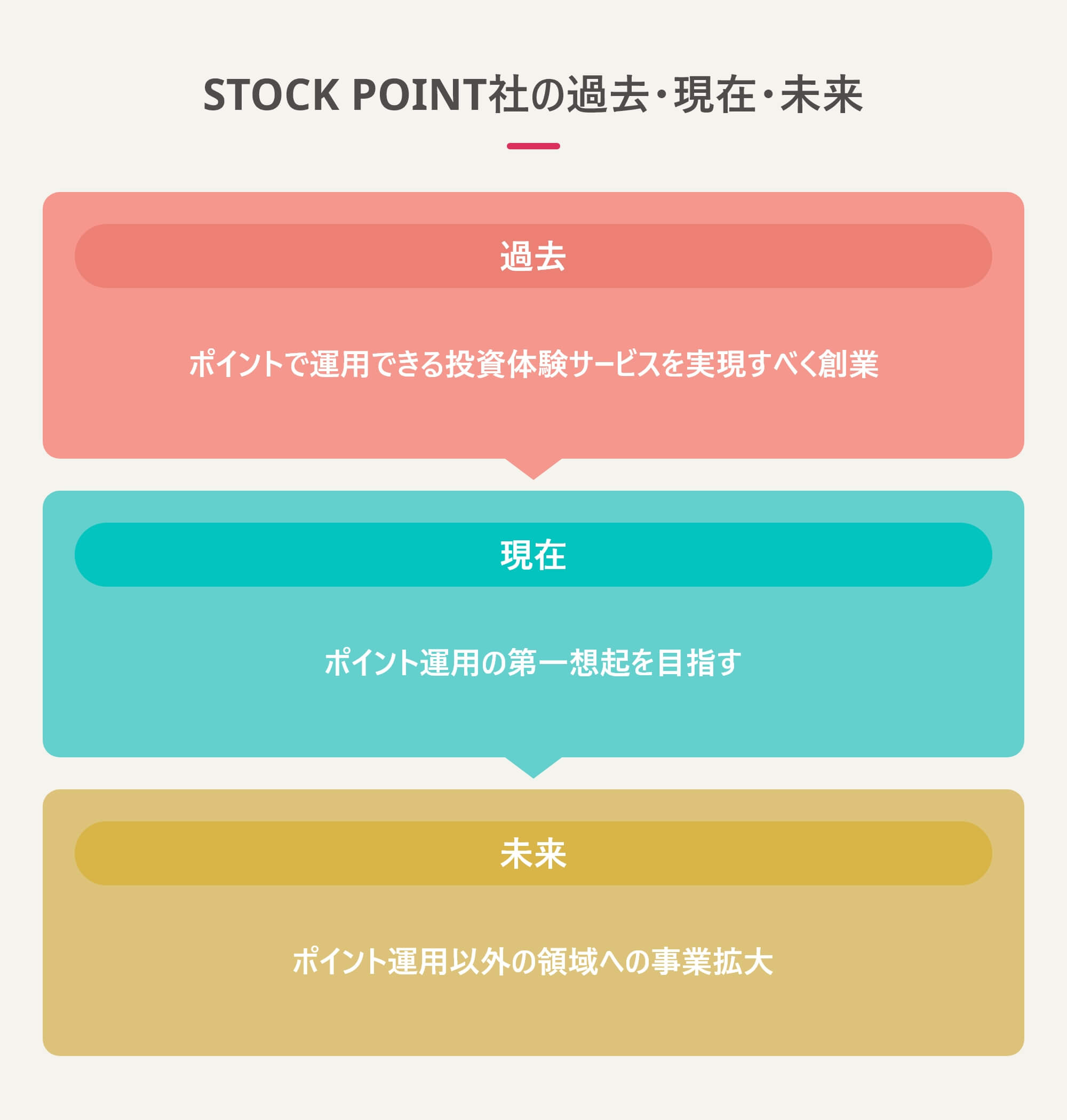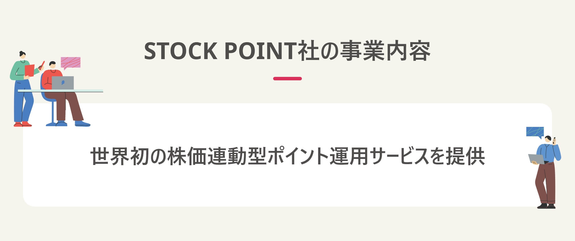 代表の土屋清美が最初に創業した金融機関向けITサポートの会社を経営するなかで、日本人の金融リテラシー問題の存在に着目。その解決策として着想した「誰もが持つポイントを使って資産運用・投資する」というサービスを実現するため2016年にSTOCK POINTを設立。同年中に個別株の値動きとポイントを連動させた「株価連動型ポイント運用システム」の特許を取得。2017年に「StockPoint」サービスをリリース。その後、クレディセゾンの永久不滅ポイントや、ロイヤリティマーケティングのPontaポイントなどのポイント提携先を拡大。現在は「StockPoint」の他に、金融機関がスポンサードする「StockPoint for CONNECT」、「STOCKPOINT for MUFG」、「StockPoint for CHEER証券」があり、株主体験ができる「ココカブ」などのサービスも展開している企業詳細:コーポレートサイト
