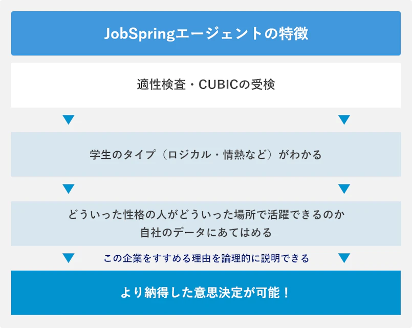 Q.特にエージェントサービスにおける利用の方法や特徴などを教えてください。登録方法は至ってシンプルで、現在登録している学生の多くはJobSpring onlineの記事内にあるリンクから会員登録をしています。そのあとアンケートへ回答してもらい、面談日を決めて面談、という流れですね。JobSpringエージェントでは適性検査のひとつ、CUBICを無料で受けられます。そしてそのCUBICの性格検査の結果をもとに企業紹介をしていますね。どういった性格の学生がどのような企業で活躍する可能性が高いのかというデータを当社でもっており、受検後は性格の分布表のようなものに学生がプロットされるようになっています。そしてこの学生はロジカルタイプ・情熱タイプだ、このタイプの学生はこういった企業の営業職が合うだろうというロジックを当社で組んでいます。エンジニア志望の学生が突然営業職をすすめられてもすぐには納得できませんよね。でもJobSpringではあなたにこの企業をすすめる理由を論理的に説明できるので、より納得した意思決定ができるのではないかと思っています。