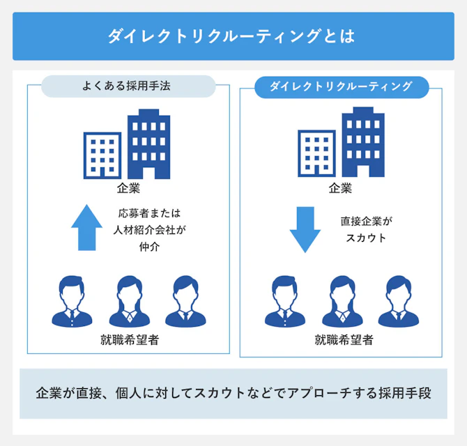 PRO SCOUTは、企業がダイレクトリクルーティングを成功できるように、上流から一気通貫で支援するサービスです。ダイレクトリクルーティングとは、企業が直接、個人に対してスカウトなどでアプローチする採用手法で、転職者だけでなく新卒生の採用にも広がってきています。
