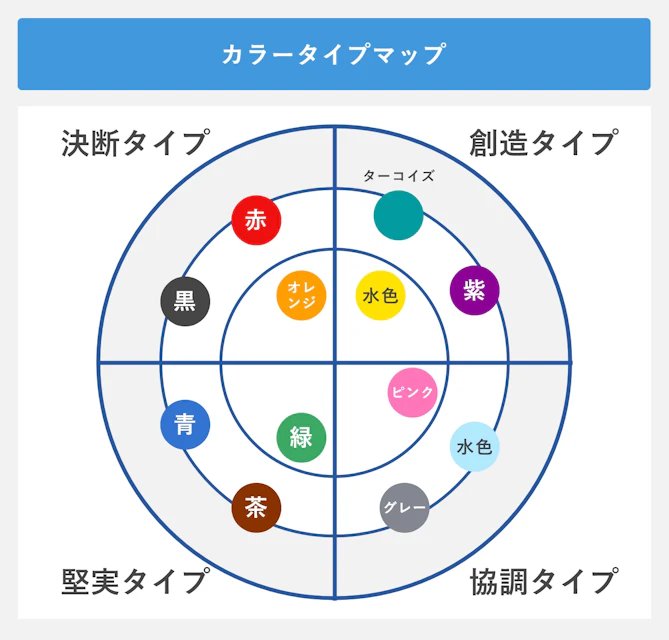 それをもとに私が2009年にカラータイプという理論を開発しました。たとえば黒には「威厳」や「完璧主義」、赤には「ドラマチック」や「目立ちたがり」など、各色にはそれぞれが持つイメージや性質があります。それらの色を、心理的にタイプが近いものを近くにつらね、遠いものは離してというように試行錯誤して作成しています。