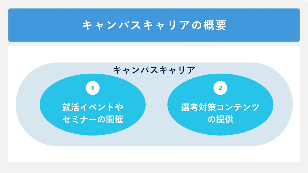 Q.キャンパスキャリアの概要について教えてください。キャンパスキャリアは2つのサービスから成り立っています。1つがオンラインの就活イベントやセミナーの開催。これは企業を知る機会だと思ってもらえればと思います。もう1つが選考対策コンテンツの提供。先輩たちのESや面接フェーズごとの頻出質問などを企業単位で提供しています。