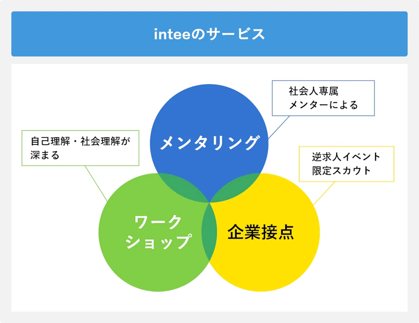 intee(インティー)は、「自分の意志でキャリアを切り拓く」をテーマにした就活支援サービスです。メンターによるメンタリング、キャリアワークショップ、企業とのイベントの3つのコンテンツを通して、学生が自らの意志で人生を切り拓いていくためのサービスを展開しています。