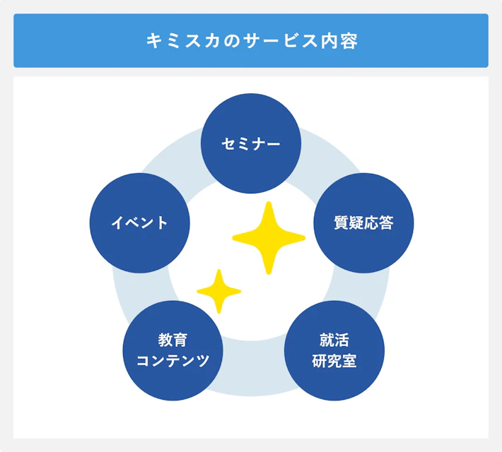 ほかのスカウト型就活サービスには、サービス内の機能や仕組みが充実しており、それが強みとなっているものもあります。でも私たちが大切にしていることは「人との触れ合い」です。たとえばキミスカでは、オンライン上のサービス展開にとどまらずに学生向けのセミナーやイベントの開催、キミスカの使い方やITスキルなどを習得できる教育コンテンツも用意しています。キミスカ公式の就活コラム「就活研究室」では、内定者の話も掲載しています。就活初心者でもキミスカで就活を0からスタートできるように、学生に寄り添ったサービスであることを意識しています。