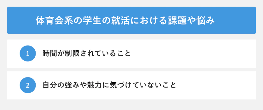 まず時間が制限されているということです。そもそも体育会系の学生の多くは、大学4年の夏から、遅い人だと12月頃までずっと部活を続けています。就活をスタートさせるのもそれからです。昨今は多くの学生が大学3年頃から就活を始める中、 スタートがかなり遅れてしまいますよね。また、部活と就活とを両立させるとしても比重はほぼ確実に部活。それでは、就活で必要な情報を十分に集めることは難しいでしょう。また、就活で必ず問われる自己PR。体育会系の学生には、ここでアピールできる強みが本当に多くあるのに、それに気づけていないのも課題だと感じています。自分がこれまでやってきたことや培ってきたものがすごいことだと認識し、それを自分なりの言葉にして周りと差別化を図るということも、体育会系の学生が絶対にやるべきで、かつできていないことだと思います。