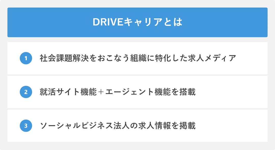 NPO法人ETIC.(エティック)が運営する社会課題解決に特化した求人メディアがDRIVEキャリアです。ただETIC.は人材紹介業もおこなっているので、メディアで紹介している企業の一部に関しては、就活エージェントのように個別に企業紹介もしています。つまりDRIVEキャリアは実質的に就職サイト機能とエージェント機能を併せ持ったサービスを提供するサイトだと捉えてもらえると良いですね。