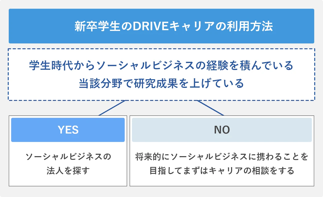 DRIVEキャリアのキャリアコーチングでは、転職を中心にソーシャルビジネスの起業や副業など、幅広いキャリアステップの相談を受け付けています。新卒の利用は少し珍しいケースにはなりますが、先ほども説明したように、将来的にソーシャルビジネスを目指す学生の進路に関する相談に対しても、長期的な視点に立ってお手伝いができると思います。まずは一度気軽に相談してみてくださいね。