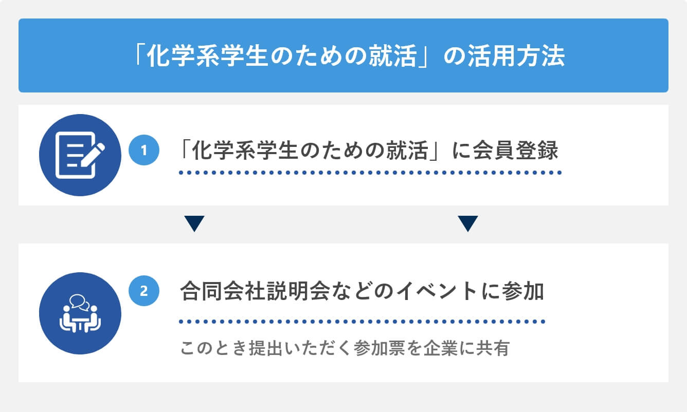 「化学系学生のための就活」のイベントはスカウティングを前提としたものではありません。イベント参加者には参加票を提出してもらい企業と共有するので、企業からのアプローチはあるかもしれませんが。企業からのアプローチ有無問わず、企業の情報収集やエントリー・選考参加については就活生の自己責任でおこなっていただいています。