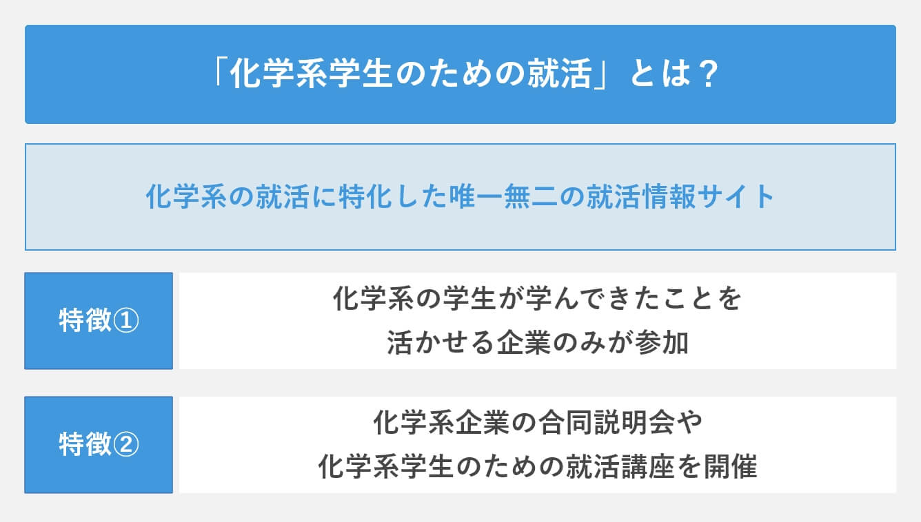 そうです。主に化学系の学部生や大学院生を対象とする情報サイト「化学系学生のための就活」を中心に、さまざまな就職関連情報の発信やサービスを提供しています。会員制となっており、現在の会員は学部生より大学院生が多く7割程度を占めます。サイトには化学関連企業の採用情報やイベント情報なども掲載されています。つまり化学系学生と化学系企業に的を絞っているのが最大の特徴です。化学系企業への就職を志望する就活生と、主に研究開発職や技術職として学生を採用したい化学系企業が、互いに効率よくマッチングできる仕組みになっています。