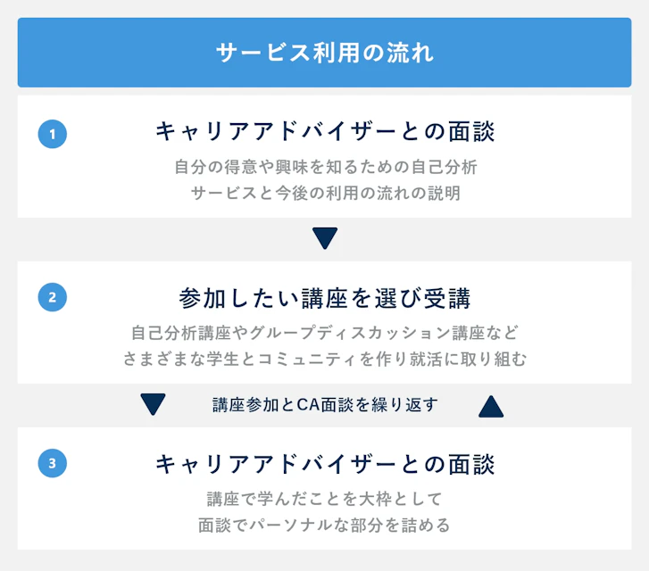 CAとの面談と、多くの学生で構成されるコミュニティでの講座受講を繰り返し、チーム戦で就活を進める
