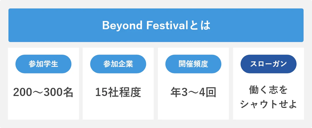 無料で使える学生向けのパーソナルキャリアデザインのサービスです。就活支援サービスは数多くありますが、Beyond Cafeの大きな特徴の一つがイベント。そしてその中でも日本最大級のオンライン就活イベントが「Beyond Festival」です。200~300名の学生と15社ほどの企業が参加。学生はもちろん、企業側の参加者も全員が私服でラフな雰囲気です。堅苦しい会社説明会などとはまったく逆の本音トークができる空間を提供します。まさにロックフェス的なノリで楽しく気軽に楽しめる内容が人気のイベントで、スローガンは「働く志をシャウトせよ」です。