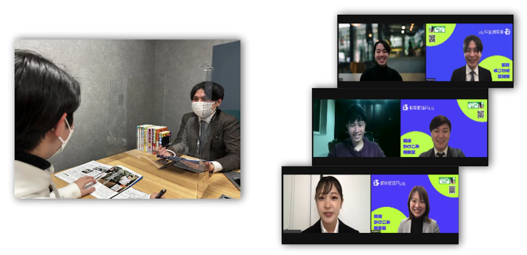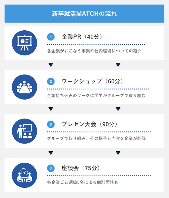 はい、新卒就活PLUSは、一般的なエージェントサービスと「新卒就活MATCH」というマッチングイベントから成り立つサービスです。「新卒就活MATCH」とは少人数制のマッチングイベントです。企業5社と学生30名が参加して、だいたい5グループほどに分かれてイベントが進みます。企業からの会社説明、ワークショップ、プレゼン大会、座談会の4つでプログラムが構成されています。一時期新型コロナウイルスの影響で開催数がかなり減りましたが最近は開催数が徐々に増えつつあります。このイベントは基本的に対面でおこなっているのですが、私はこの「対面」にかなりこだわっています。