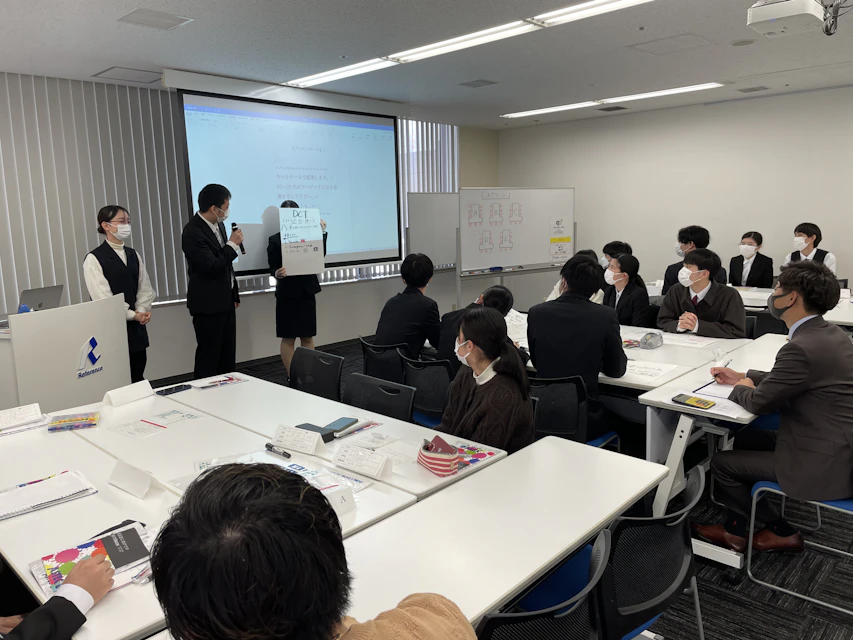 まずは企業の会社説明ですね。企業のPRを聞き、オンタイムで参加企業に対し興味関心度合いで評価・ランク付けをしていきます。そのあとのワークショップですが、これは企業持ち込みのワークを学生がおこないます。たとえばテトリスの難しいモードをプレイしながら質疑応答に取り組んだり、「このペンを私に10万円で売ってください」などというお題に取り組んだりですね。1ワーク10分、それを5社分おこないます。プレゼン大会では、当社が用意したお題に学生がグループごとで取り組んでいきます。
