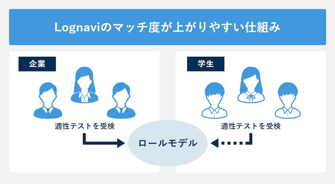 Q.その「マッチ度が上がる」、これはどうしてでしょうか? 詳しく教えてください。まず、企業側にはまずその企業で活躍する社員に適性テストを受けてもらっています。これで採用したい学生のロールモデルが見えてきますよね。そして登録と同時に学生にも適性テストを受けてもらいます。学生の適性と企業の求める人物像とがマッチしているかが定量的にわかりますよね。